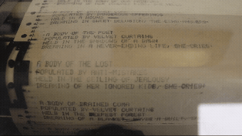 Code (in Visual Studio Code) 1 REM CREATE 4 ARRAYS AND PRINT 5 VERSES (FOR APPLE2E) 5 OPEN 3,4 8 CMD 3 10 DIM A$(39) 11 A$(0) = “LONGING” 12 A$(1) = “ADDICTION” 13 A$(2) = “COMRADE” 14 A$(3) = “THE LOST” 15 A$(4) = “FRICTION” 16 A$(5) = “MOURN” 17 A$(6) = “SACRIFICATION” 18 A$(7) = “AN OLD MAN” 19 A$(8) = “SELF-DOUBT” 20 A$(9) = “THE LAST REMAINED” 21 A$(10) = “LUST” 22 A$(11) = “EMPTY POCKETS” 23 A$(12) = “ORDER” 24 A$(13) = “'PLEASE THIS CANNOT GO WRONG'” 25 A$(14) = “OUTSIDER” 26 A$(15) = “BROKEN SPINE” 27 A$(16) = “OUTBALANCED FEAR” 28 A$(17) = “DISGRACE” 29 A$(18) = “THE POET” 30 A$(19) = “BURNED INDUSTRY” REM 2ND TYPED-IN 31 A$(20)="UTOPIA" 32 A$(21)="A MODERN CRUSADER" 33 A$(22)="PURITY" 34 A$(23)="REINCARNATION" 35 A$(24)="A SMILE" 36 A$(25)="ABSURDITY" 37 A$(26)="CHRIST" 38 A$(27)="ANYTHING" 39 A$(28)="ONE OUNCE" 40 A$(29)="ENCHANTED TIDES" 41 A$(30)="TORTURE SYSTEM" 42 A$(31)="DISINTEGRATION" 43 A$(32)="ACHILLES" 44 A$(33)="SOUND" 45 A$(34)="DEREALIZATION" 46 A$(35)="SICKNESS" 47 A$(36)="SUICIDE" 48 A$(37)="PEACE IS COLD" 49 A$(38)="SHYNESS" 50 A$(39)="COMMON SENSE" 60 DIM B$(42) 61 B$(0) = “PEOPLE” 62 B$(1) = “YEARNINGS” 63 B$(2) = “BLANKNESS” 64 B$(3) = “ATTRACTION” 65 B$(4) = “CURLS” 66 B$(5) = “WEAK BREATHS” 67 B$(6) = “thousands of WINGS” 68 B$(7) = “OLD DYING DAYS” 69 B$(8) = “OPIUM” 70 B$(9) = “DESPAIR” 71 B$(10) = “SOURNESS” 72 B$(11) = “LIGHTS” 73 B$(12) = “MASSACRE” 74 B$(13) = “ADORATION” 75 B$(14) = “ghosts FROM THE PAST” 76 B$(15) = “TORN DIARIES” 77 B$(16) = “POEMS IN THIS DEPRESSED HEAD” 78 B$(17) = “CLOWN LAUGHTERS” 79 B$(18) = “THE SPIRIT OF THE GRAPE” 80 B$(19) = “VINES” REM 2ND TYPED-IN 81 B$(20) ="FOAMS" 82 B$(21)="WHAT SHE THOUGHT IS INVISIBLE" 83 B$(22)="WET ECSTASY" 84 B$(23)="DUSTY BOOTS" 85 B$(24)="PRISONERS of the heart" 86 B$(25)="KNIFES" 87 B$(26)="SLOW WHEELS" 88 B$(27)="CUTS ON SKIN" 89 B$(28)="HEART BEATS" 90 B$(29)="GRAPES SEEDS" 91 B$(30)="DIMENSIONS OF LOGIC" 92 B$(31)="SOMETIMES WHITE KEYS, OTHER TIMES BLACK" 93 B$(32)="BELIEFS" 94 B$(33)="ANTI-MISTAKES" 95 B$(34)="OLD-SCHOOL POETRY TEACHINGS" 96 B$(35)="APOLOGIES" 97 B$(36)="KISSES THAT HOPEFULLY WON'T HURT" 98 B$(37)="CONFORMITY" 99 B$(38)="OUR OFFSPRINGS" 100 B$(39)="VELVET CURTAINS" 101 B$(40)="DANGEROUS OFFERINGS" 102 B$(41)="UNDERGROUND SERVICES" 103 B$(42)="FORBIDDEN BOOKS" //104 B$(43)="DECIDED CATASTROPHE" 105 B$(44)="BUTTERFLIES" 106 B$(45)="MASKS SHE HATEDS" 107 B$(46)="SAGES" 108 B$(47)="PEOPLE LEFT HERE"// 110 DIM C$(39) 111 C$(0) = “HIS CONVERSATION” 112 C$(1) = “THE DEEPEST FOREST” 113 C$(2) = “AN ENCLOSED HEART” 114 C$(3) = “MOTHER’S WOMB” 115 C$(4) = “FATHER’S PAIN” 116 C$(5) = “NOWHERE” 117 C$(6) = “A SIGH” 118 C$(7) = “THE HOUSE OF DUST” 119 C$(8) = “CONTRADICTION” 120 C$(9) = “THE EARTHLY HEIGHT” 121 C$(10) = “THE EARLY BEAUTY” 122 C$(11) = “A WOUND” 123 C$(12) = “GIANTS’ HEADS” 124 C$(13) = “THE CEILING OF JEALOUSY” 125 C$(14) = “BLOOD deficiency” 126 C$(15) = “KILLINGS” 127 C$(16) = “CENTURIES” 128 C$(17) = “THE HEART OF A FEATHER” 129 C$(18) = “MY BOWL” 130 C$(19) = “LOVE (UNSPOKEN)” REM 2ND TYPED-IN 131 C$(20) = "A RHYTHM THEATRE" 132 C$(21) = "A KNOT" 134 C$(23) = "THE MILKY WAY" 135 C$(24) = "THE SHADOWS AT NOON" 136 C$(25) = "THE SYRINGE" 137 C$(26) = "A LAHAINA NOON" 138 C$(27) = ”SURPRISES" 139 C$(28) = "SEDUCTION" 140 C$(29) = "THE ONLY HURT ONE" 141 C$(30) = "REGRETS" 142 C$(31) = "AN URN" 143 C$(32) = "A MINER'S LUNGS" 144 C$(33) = "A COUGH" 145 C$(34) = "bridge bricks" 146 C$(35) = "A BALLOON THAT FLEETED AWAY" 147 C$(36) = "SECRETIVE FEELINGS" 148 C$(37) = "THE DOWNSIDE OF OUR PAINTERS" 149 C$(38) = "THE HUMAN SYNTHESIZER" 150 C$(39) = "THE ENDLESS COLLECTION" //151 C$(40) = "CONCRETE" 152 C$(41) = "CONFUSION" 153 C$(42) = "COMMODORE 64" 154 C$(43) = "THE BASEMENT" 155 C$(44) ="THE EARLY MORNING" 156 C$(45) ="THE ONLY FRIEND" 157 C$(46) = "THE LOVERS"// 160 DIM D$(19) 161 D$(0) = “OF HER CHILDHOOD IN THE SLAUGHTERHOUSE” 162 D$(1) = “WHILE BEING LOVED AND SCREAM AT” 163 D$(2) = “BEYOND THE HIGHEST HEAVEN” 164 D$(3) = “OF ONE MORE CONVERSATION WITH HER” 165 D$(4) = “OF SWALLOWING THAT HEAD ON THAT DAY” 166 D$(5) = “AND SPINNING TILL THE END” 167 D$(6) = “OF AN UP-SIDE-DOWN WORLD” 168 D$(7) = “AND ROTTING” 169 D$(8) = “OF MOVING FORWARD” 170 D$(9) = “OF THOSE FRAGILE LEAVES” 171 D$(10) = “OF HAVING A WIFE AND A CHILD” 172 D$(11) = “ON THE FOURTH DAY OF NOVEMBER” 173 D$(12) = “IN FRIEND'S GUITAR TUNE” 174 D$(13) = “BEFORE SHE PASSED AWAY” 175 D$(14) = “OF A POTENTIAL PAST” 176 D$(15) = “FREEZINGLY” 177 D$(16) = “OF A BLANKET, MAYBE A QUILT” 178 D$(17) = “OF LEAVING EVERYTHING BEHIND” 179 D$(18) = “IN FRONT OF THE BEGINNING” 180 D$(19) = “OF THE IRONIC HISTORY” //181 D$(20) = “AND CONFUSED”// 400 DIM E$(1) 401 E$(0)=", SHE MUMBLES:" 402 E$(1)=", THE HOUSE ANSWERS:" 501 CT = 0 600 PRINT “A BODY OF “; A$(INT(RND(1)*40)) 601 PRINT “POPULATED BY "; B$(INT(RND(1)*43)) 602 PRINT “HELD IN "; C$(INT(RND(1)*40)) 603 PRINT “DREAMING "; D$(INT(RND(1)*20)) 604 PRINT “ “ 605 PRINT E$(INT(RND(1)*2)) 700 PRINT “ “ 701 CT = CT + 1 702 IF CT < 20 THEN GOTO 300 703 END 704 RUN